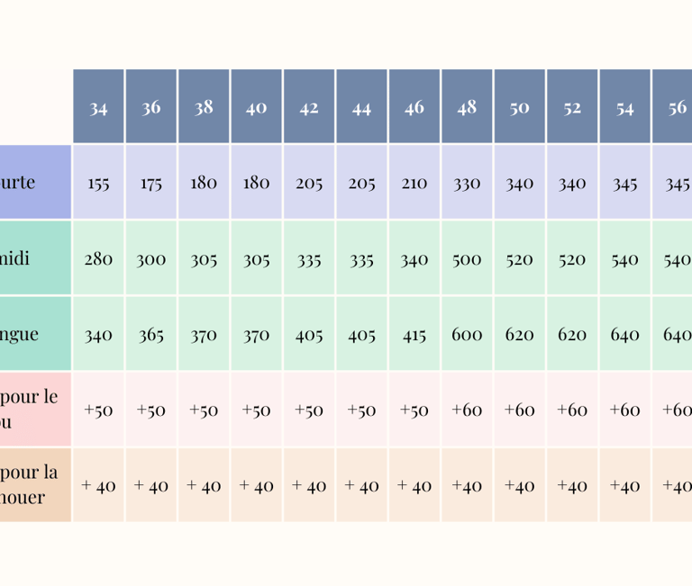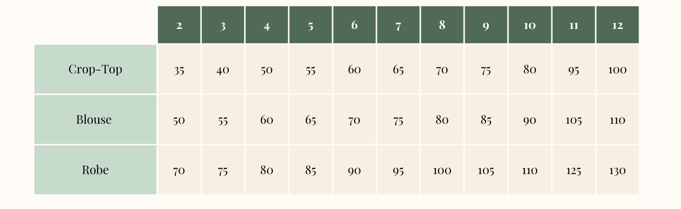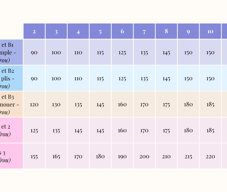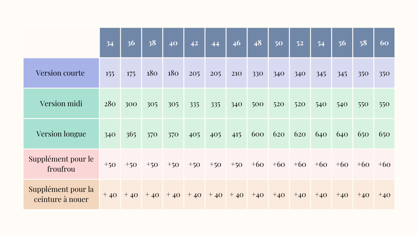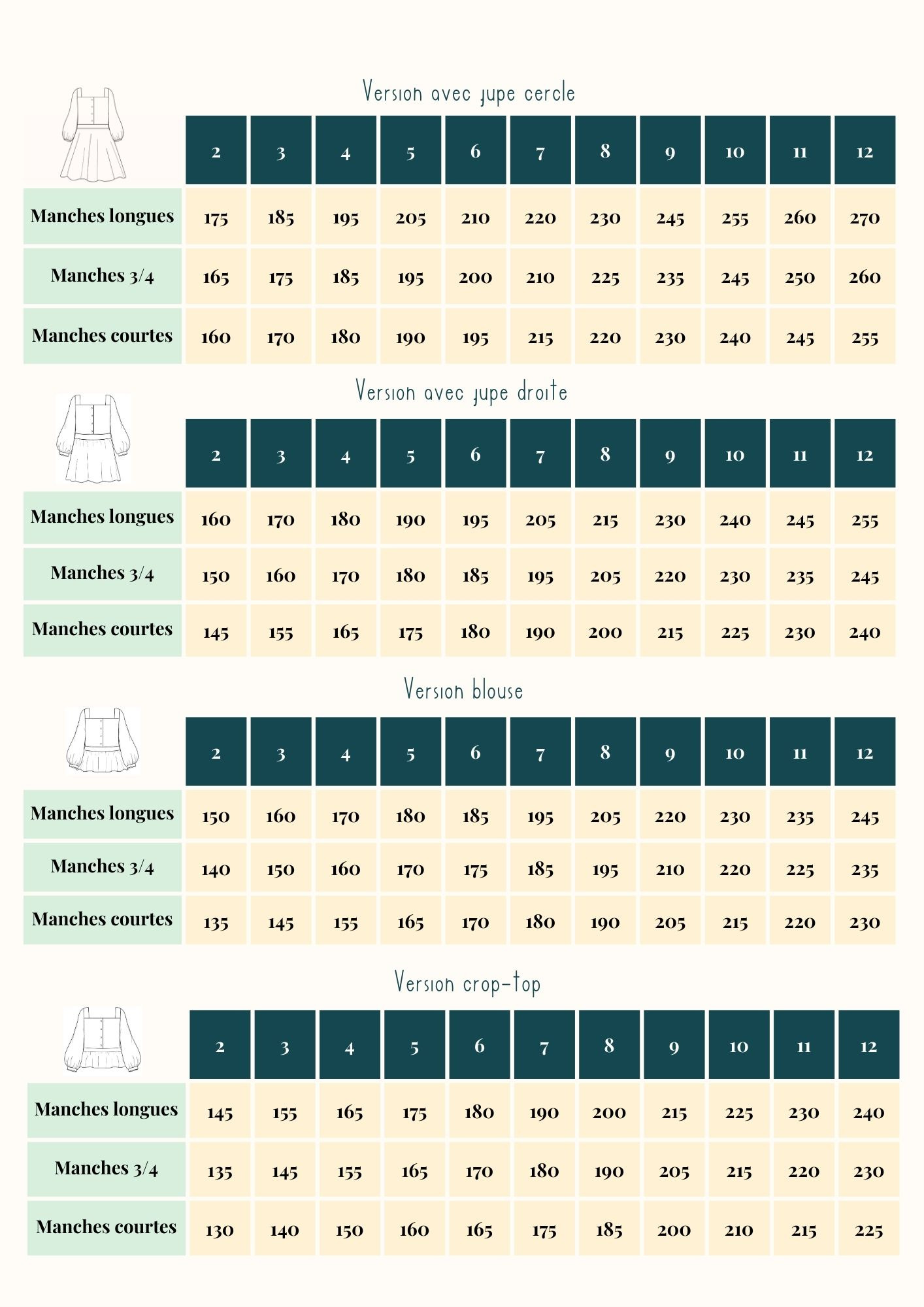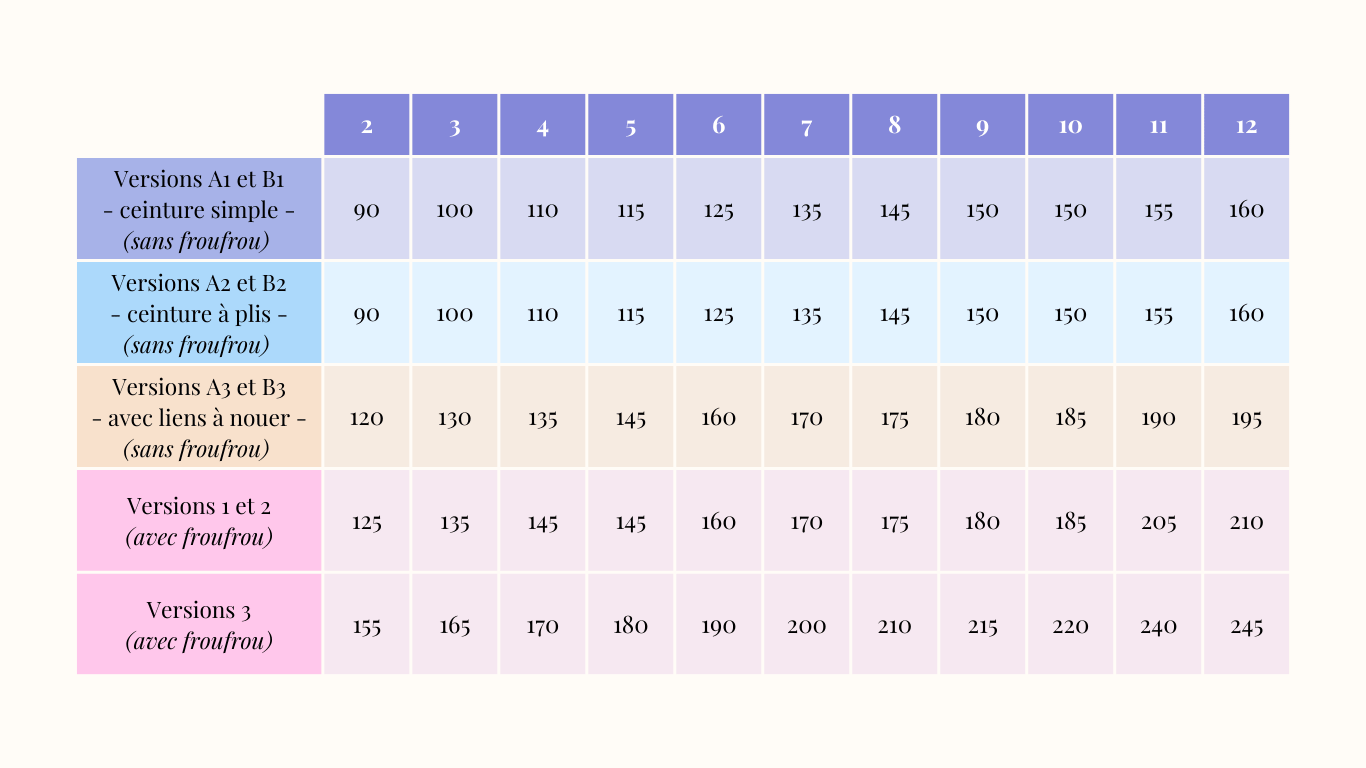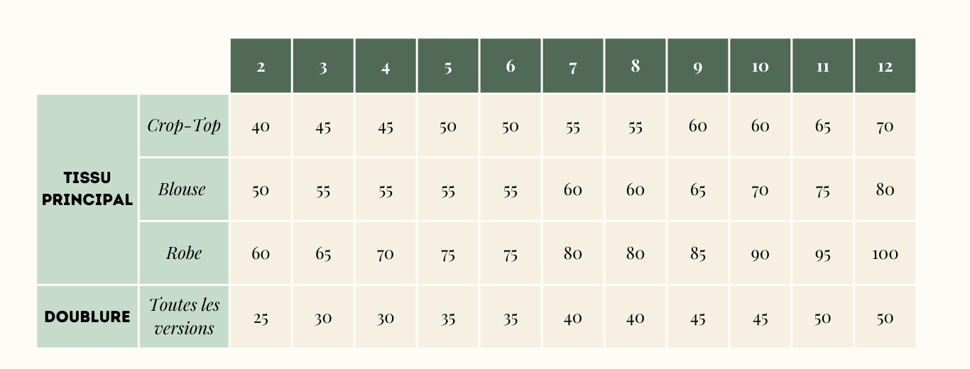 Vous trouverez ci-dessous les métrages (en cm) nécessaires pour les patrons de couture Romarine, en fonction des différentes versions possibles et tailles confectionnées. Ils sont indiqués pour une laize de 140 cm.