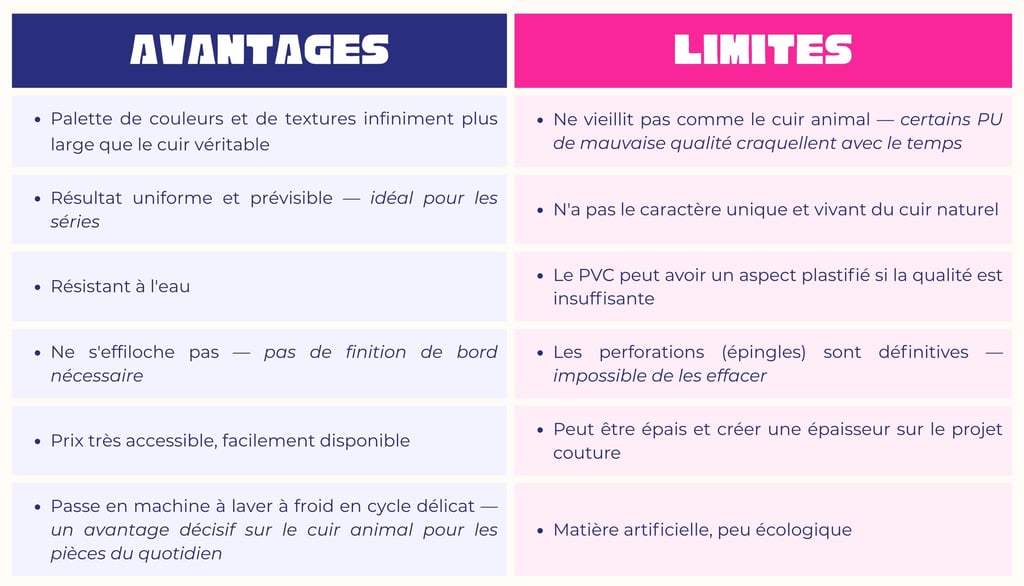 Le simili PVC — plus rigide, surface très lisse et brillante, excellente résistance à l'eau et aux taches. Son aspect très net et uniforme convient particulièrement aux compositions graphiques et modernes. Il est en revanche moins agréable à coudre que le PU, et son brillant peut parfois faire "plastique" selon la qualité.