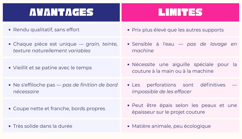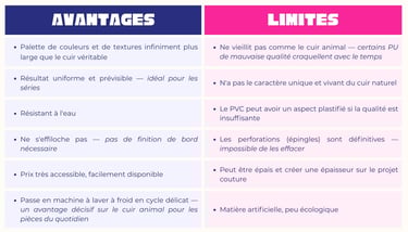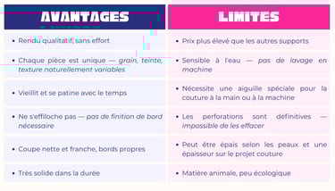Pour les cuirs végétaux alternatifs, commencez par commander un échantillon avant d'investir — la qualité et le rendu varient beaucoup selon les marques et les lots.
