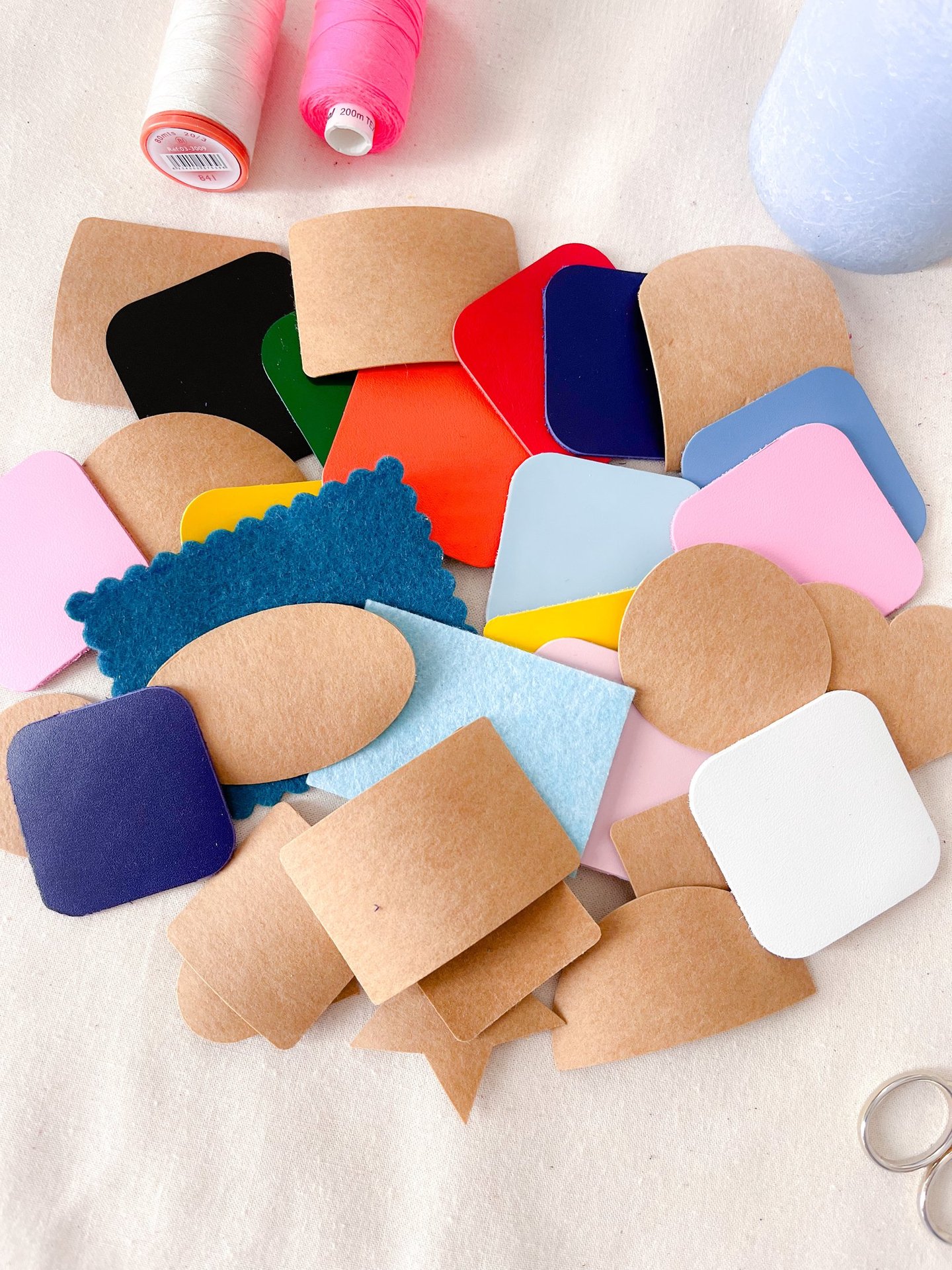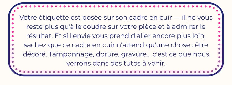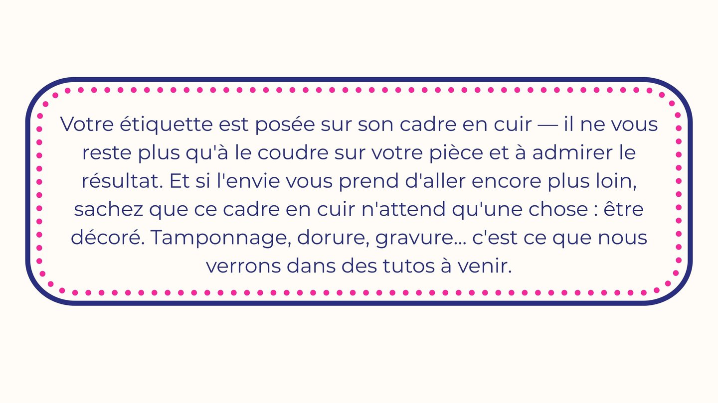 L'idée est simple : avant de coudre votre étiquette sur votre création, il est possible de la fixer sur un morceau de matière découpé — cuir, feutrine, simili, tissu, liège… Ce morceau devient un cadre, un fond, une respiration visuelle entre l'étiquette et le tissu qui l'accueille. C'est l'ensemble — cadre + étiquette — qui est ensuite cousu sur la pièce finale.