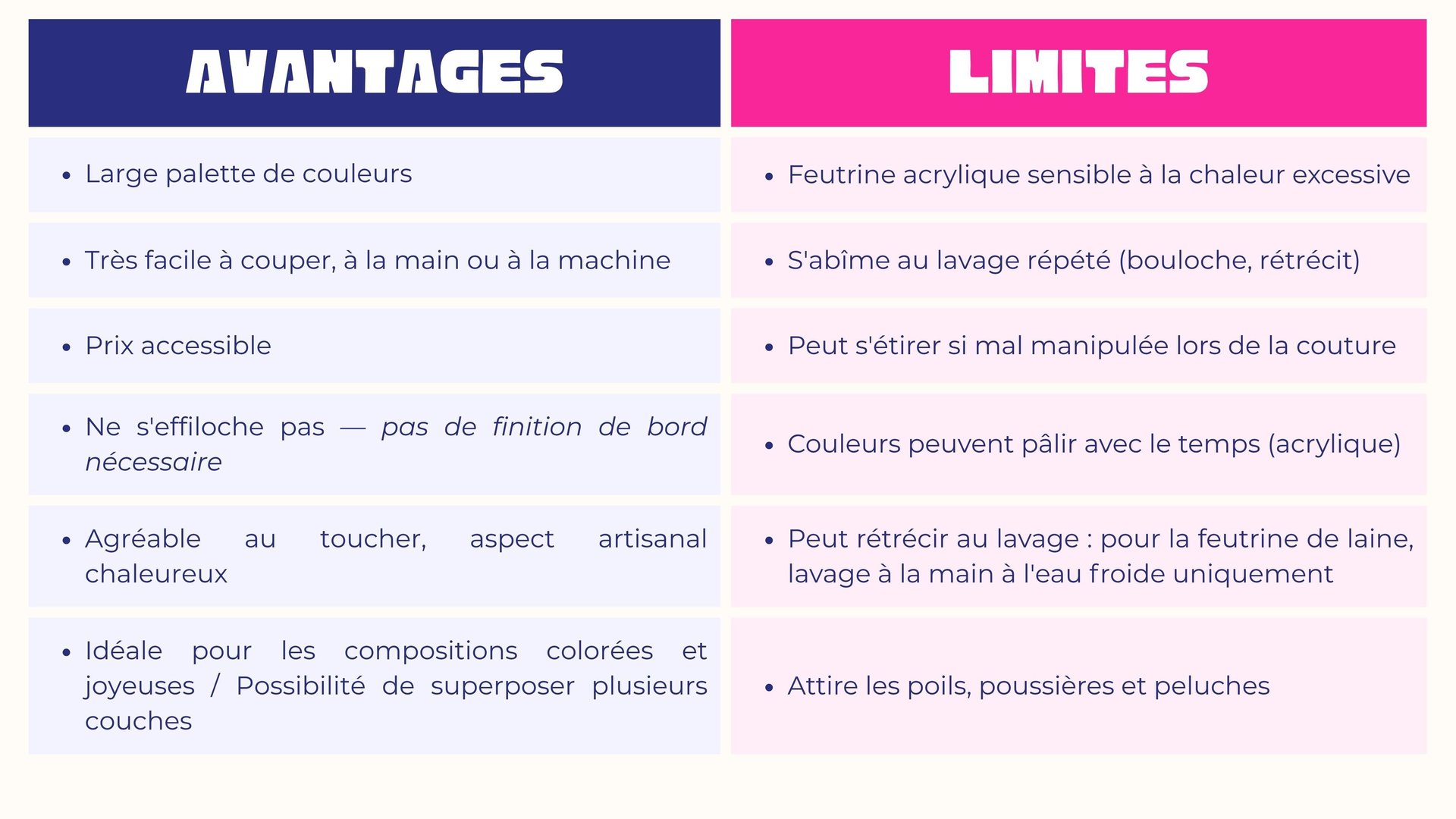 La feutrine laine ou laine/viscose — plus dense, plus noble, elle possède une meilleur tenue dans le temps. Elle supporte mieux la chaleur et le vieillissement. Son toucher est plus agréable et son aspect plus raffiné. Elle est aussi un peu plus chère et moins disponible en couleurs vives.