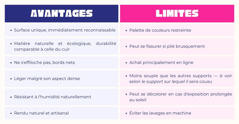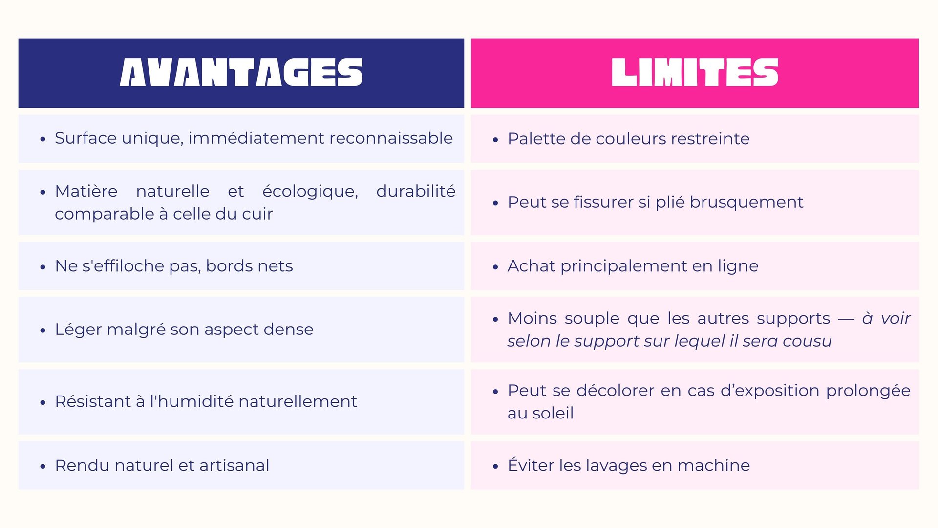 Le liège utilisé en couture créative est ce qu'on appelle le cork fabric — une feuille de liège naturel très fine collée sur un support textile (généralement un backing en polyester). Ce support textile lui donne de la souplesse et lui permet de se coudre comme un tissu classique, tout en conservant la surface et le toucher du liège.