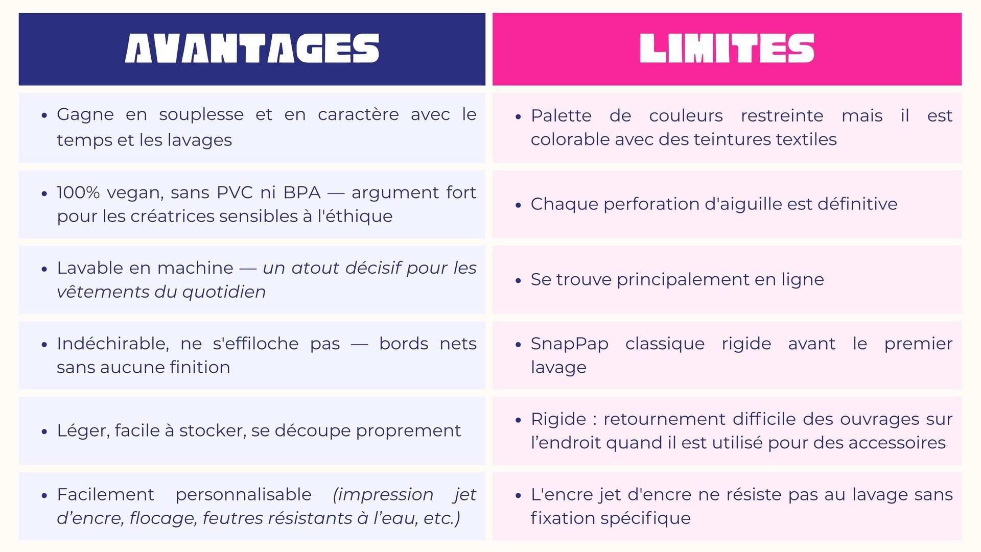 Le fil — polyester standard (n°50) pour une couture discrète. Le SnapPap étant souvent utilisé pour son aspect naturel et artisanal, un fil dans les tons ou légèrement contrastant donne un joli résultat. Éviter le fil coton qui résiste moins bien dans le temps.