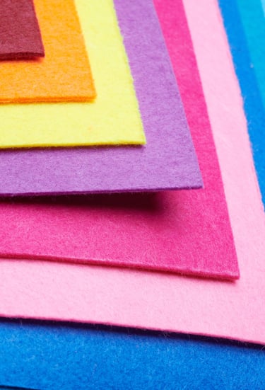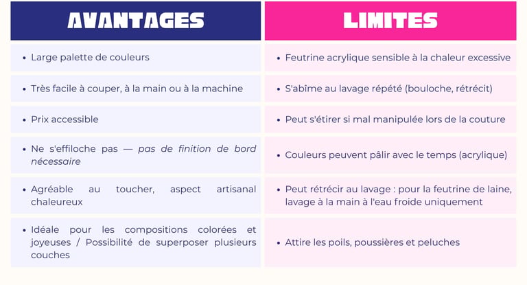 La feutrine acrylique — la plus courante, la moins chère. Disponible dans une palette de couleurs très large, elle supporte modérément la chaleur et peut légèrement se déformer si on insiste.