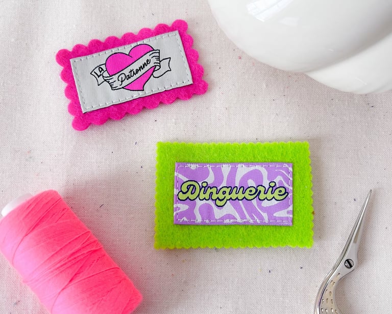 Cousue directement sur un tissu à motifs imposants et/ou de couleurs foncés, une étiquette peut avoir tendance à disparaître, se noyer ou se perdre. Bref, elle se voit peu... Non pas parce qu'elle soit mal choisie — mais parce qu'elle manque de contexte visuel pour exister pleinement.